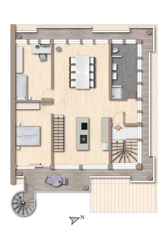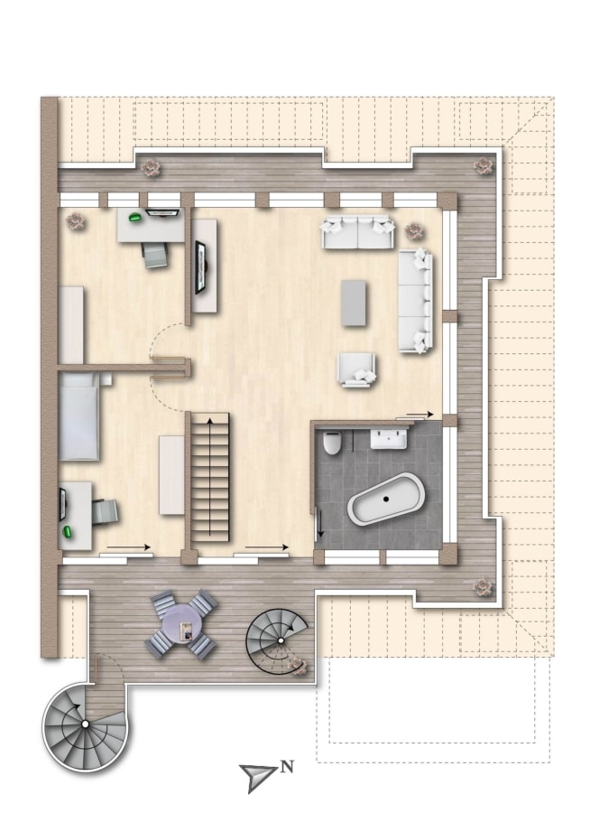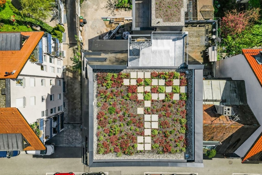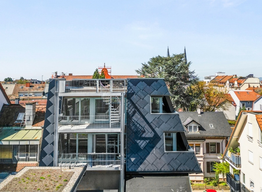 Den krönenden Abschluss bildet die oberste Dachterrasse mit angelegtem Dachgarten mit nahezu 360°-Blick. Ob Sonnenaufgang über den Schwarzwaldhöhen oder stimmungsvolle Abendstunden mit Blick auf die Lichter der Stadt – hier erleben Sie Freiburg aus einer einzigartigen Perspektive. Diese außergewöhnlichen Außenflächen erweitern den Wohnraum auf beeindruckende Weise und schaffen ein Lebensgefühl, das seinesgleichen sucht.