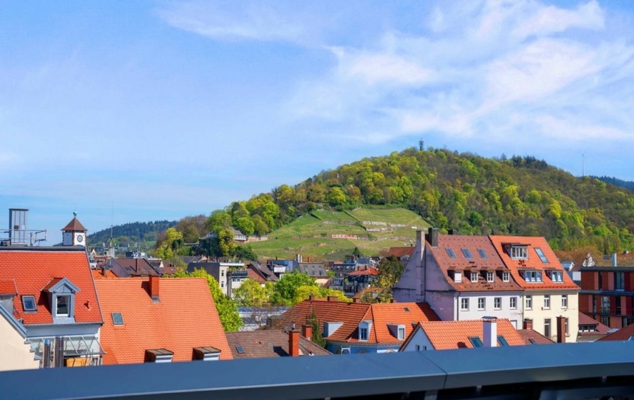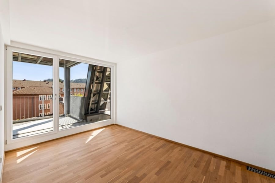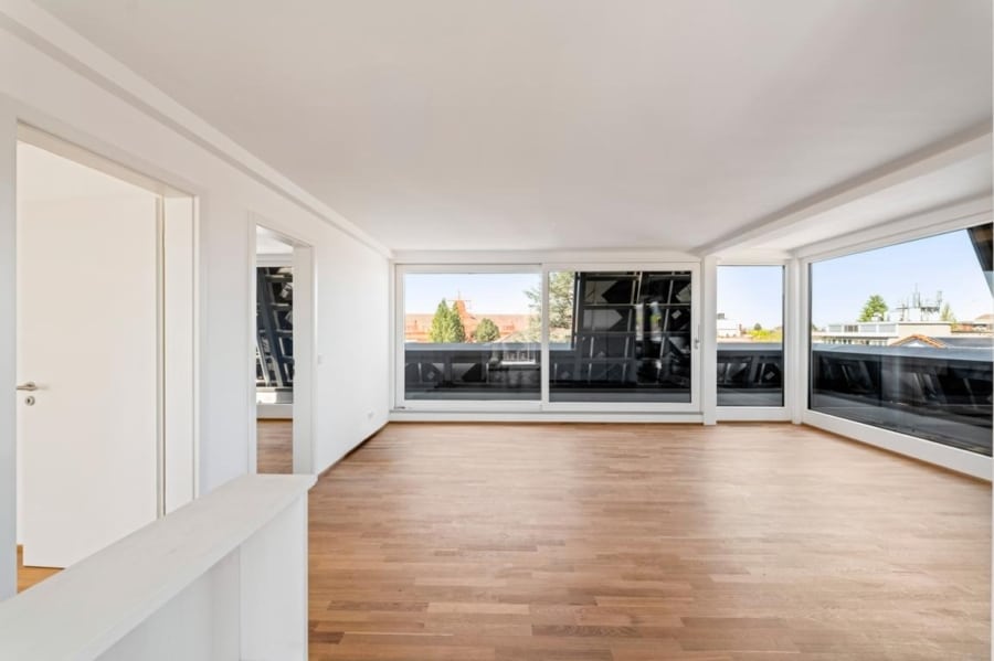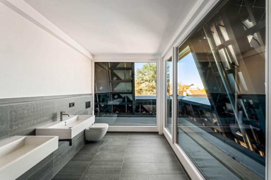 Über eine minimalistisch gestaltete, innenliegende Treppe gelangen Sie auf die obere Ebene. Hier erwarten Sie ein weiterer großzügiger Wohnbereich, zwei zusätzliche Zimmer sowie ein modern ausgestattetes Tageslichtbad mit einem fantastischen Blick auf den Schönberg. Auch auf dieser Ebene steht Ihnen ein weiterer großer Balkon zur Verfügung – ein Logenplatz über den Dächern der Stadt.