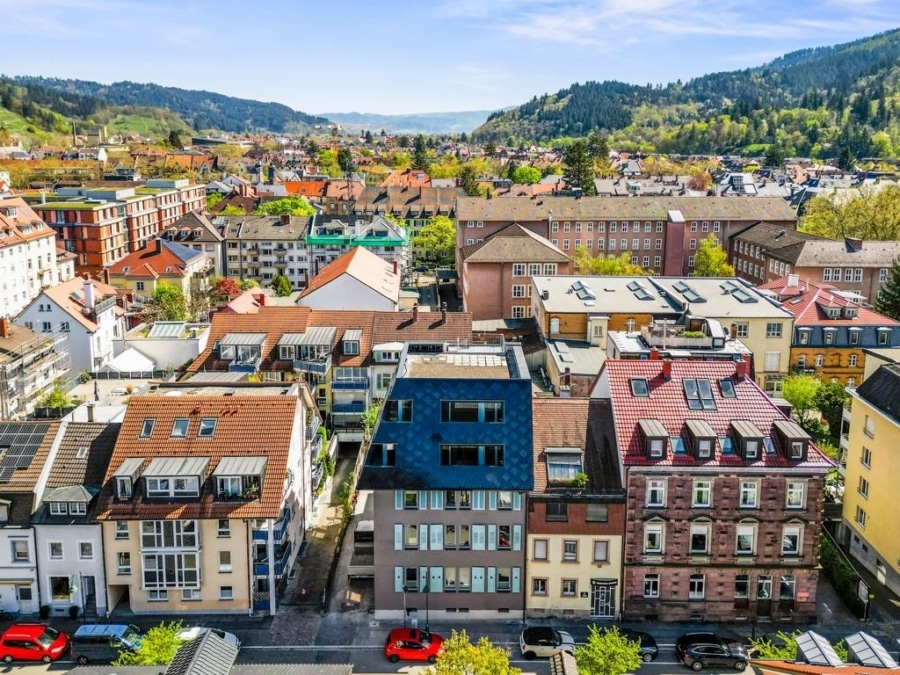Die im Zuge der Aufstockung neu entstandene Maisonette-Wohnung vereint moderne Architektur mit Wohnkomfort. Technisch und energetisch auf einem zukunftsweisenden Standard realisiert, präsentiert sich diese Wohnung in der Neubauqualität als Rückzugsort über den Dächern von Freiburg.