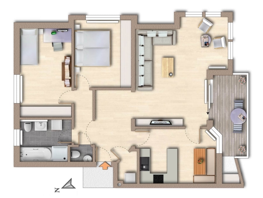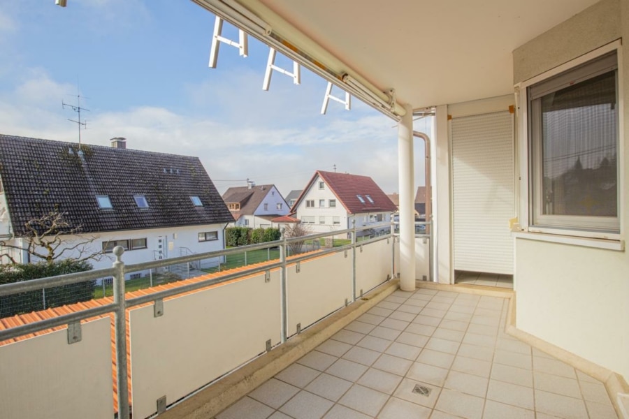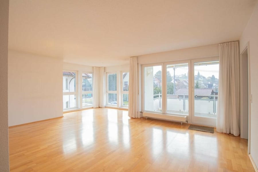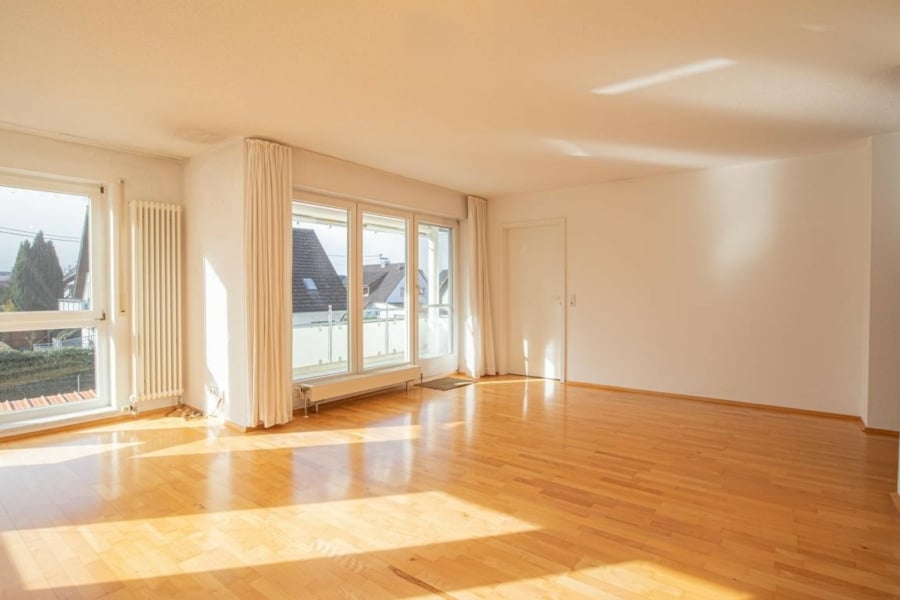 Das Herzstück der Wohnung ist der großzügige, lichtdurchflutete Wohnbereich mit direktem Zugang auf den überdachten Südbalkon. Hier genießen Sie entspannte Stunden im Freien – eine Markise sorgt an sonnigen Tagen für angenehme Beschattung und zusätzlichen Komfort.