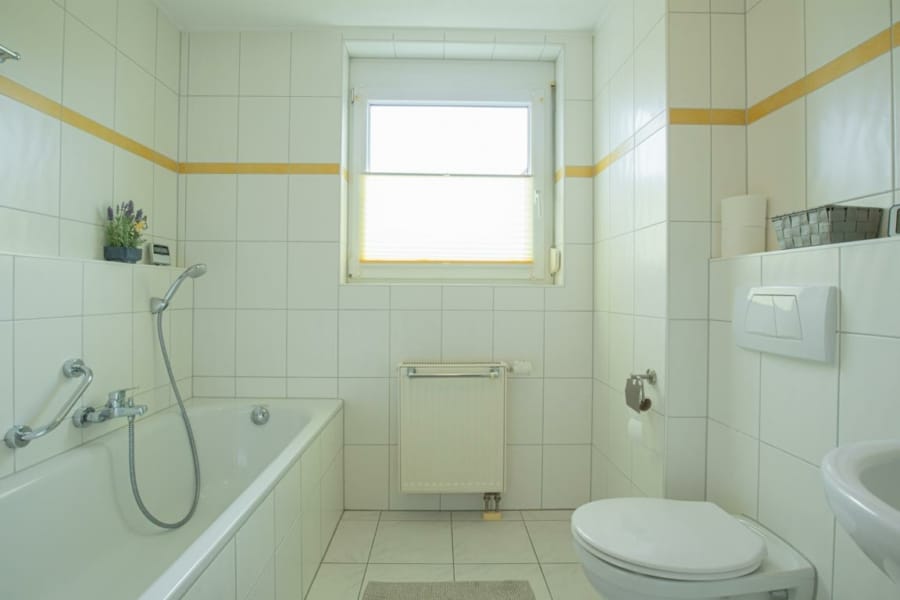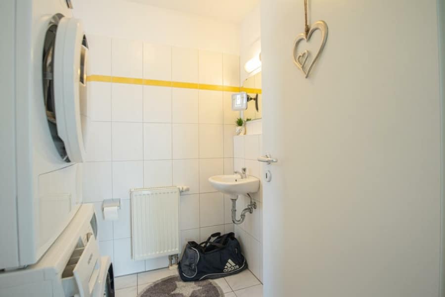 Zur Wohnung gehören zwei schöne Schlafzimmer, die vielseitig nutzbar sind – ideal als Schlafzimmer, Kinderzimmer oder Gästezimmer/Arbeitszimmer. Das Tageslichtbad ist mit Badewanne und Dusche ausgestattet, das separate Gäste-WC verfügt über einen Waschmaschinenanschluss, was zusätzlichen Komfort bietet.