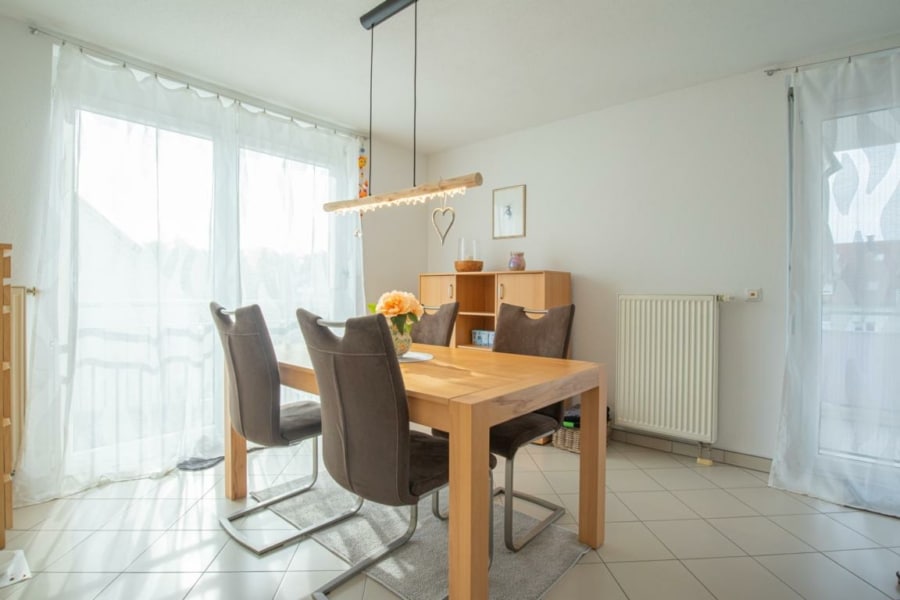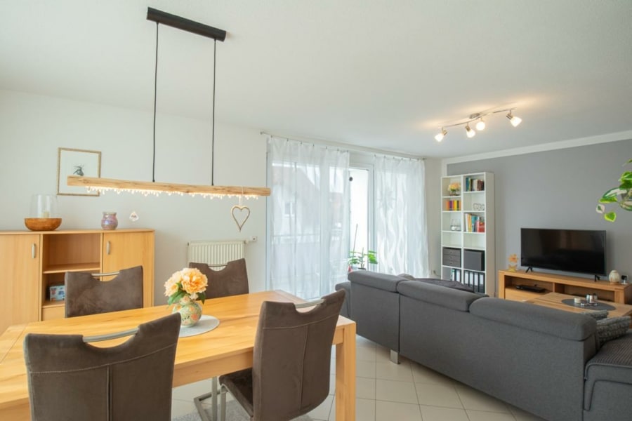 Der großzügige, offene Wohn- und Essbereich besticht durch helle Räume und viel Tageslicht, das durch große Fensterflächen einfällt. Der sonnige, überdachte Südbalkon lädt zum Entspannen und Verweilen im Freien ein. Eine separate Küche bietet ausreichend Platz für kulinarische Entfaltungen.