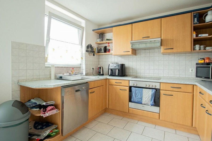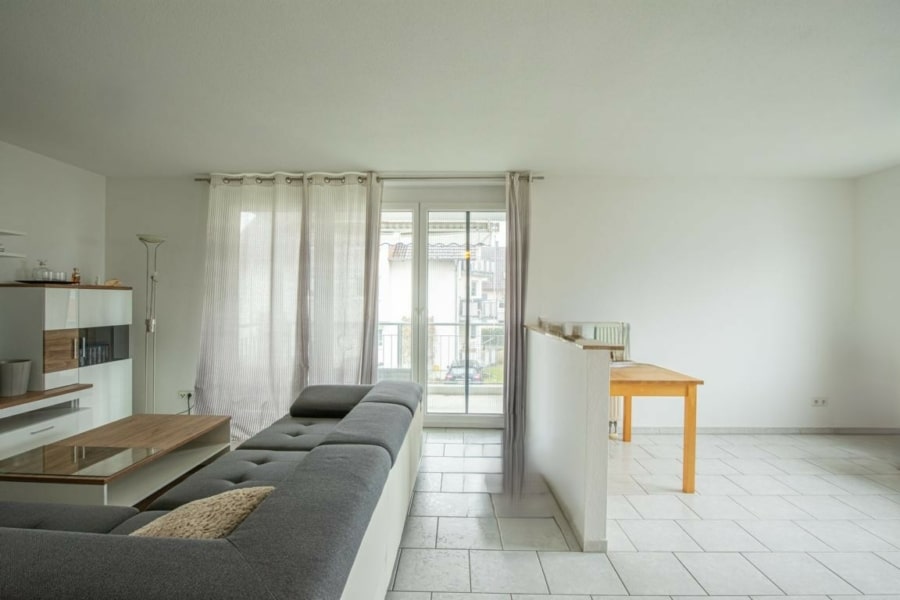 Der offen gestaltete Wohn- und Essbereich überzeugt durch großzügige Fensterflächen und eine angenehme Helligkeit. Der sonnige, überdachte Südbalkon ist mit einer Markise ausgestattet und bietet ideale Voraussetzungen zum Entspannen und Verweilen im Freien. Die Einbauküche (bereits im Kaufpreis enthalten) verfügt über ausreichend Platz und geht fließend in den Essbereich über.
