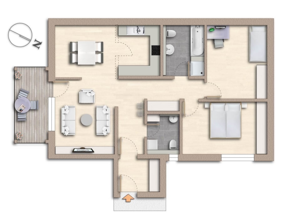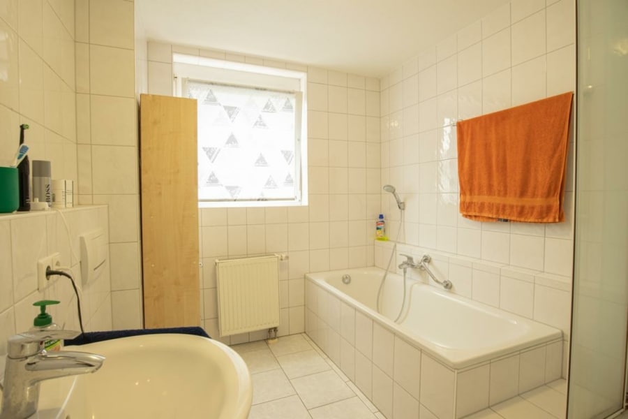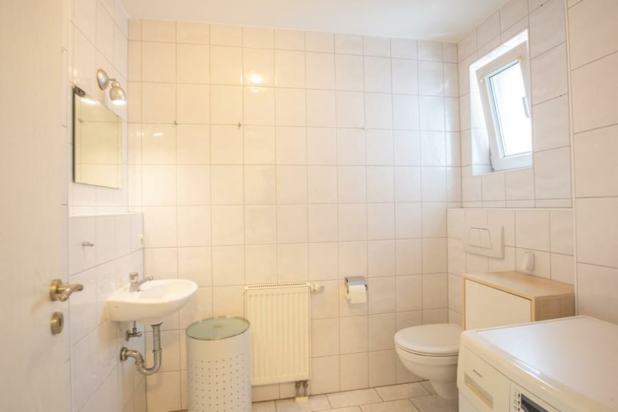 Neben dem Schlafzimmer steht ein weiteres Zimmer zur Verfügung, das sich flexibel als Kinder-, Arbeits- oder Gästezimmer nutzen lässt. Das Tageslichtbad ist mit Badewanne und Dusche ausgestattet. Ein separates Gäste-WC mit Waschmaschinenanschluss sorgt für zusätzlichen Komfort.