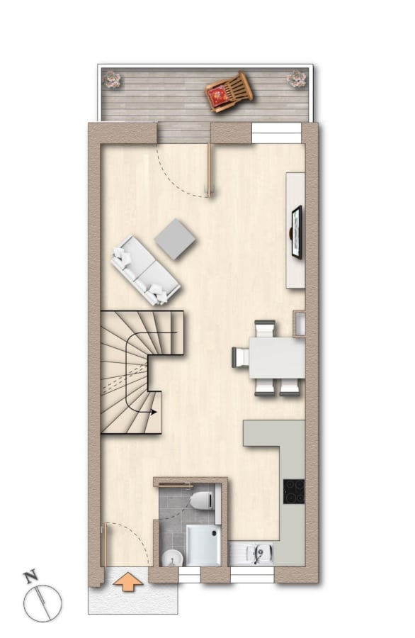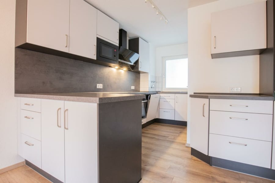 Im Erdgeschoss erwartet Sie ein großzügiger, offener Wohn- und Essbereich mit Zugang zum Balkon. Die angrenzende, moderne Einbauküche ist zeitlos gestaltet, bietet viel Arbeitsfläche sowie reichlich Stauraum und ist bereits im Kaufpreis enthalten. Ein modernes Duschbad rundet diese Etage ab.