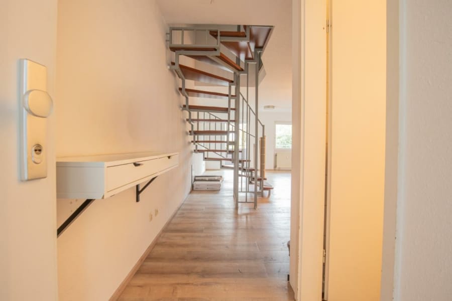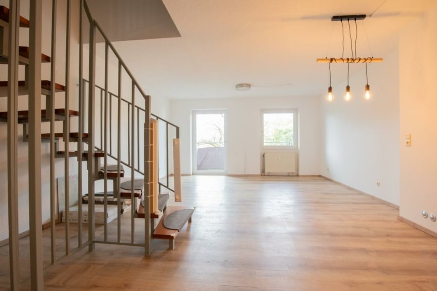 Diese schöne 3-Zimmer-Maisonettewohnung mit ca. 89 m² Wohnfläche erstreckt sich über das Erdgeschoss und das 1. Obergeschoss und verfügt über zwei sonnige Westbalkone mit schönem Ausblick ins Grüne.