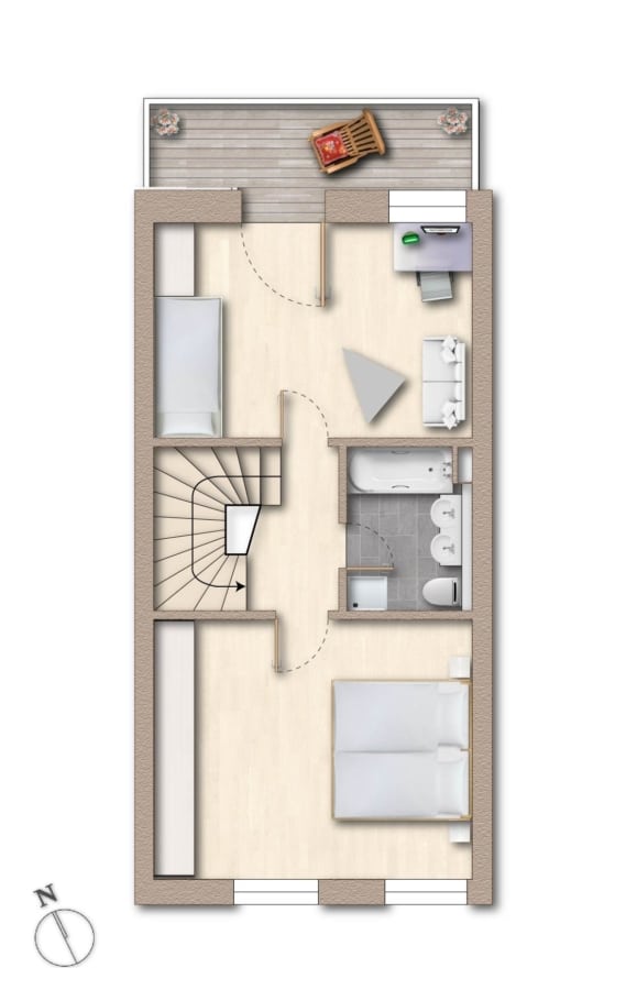 Über eine offene Wendeltreppe gelangen Sie in das 1. Obergeschoss, wo sich zwei gut geschnittene Zimmer befinden – eines davon mit Zugang zum zweiten Westbalkon. Das stilvolle Badezimmer mit Badewanne vervollständigt das Raumangebot dieser Etage.