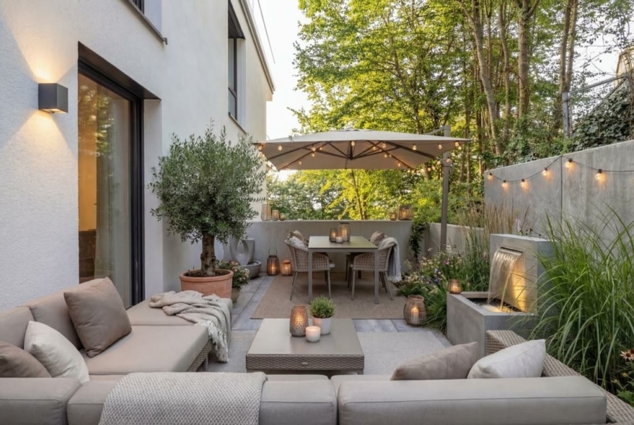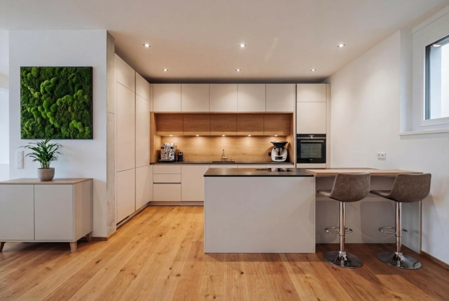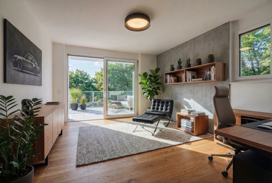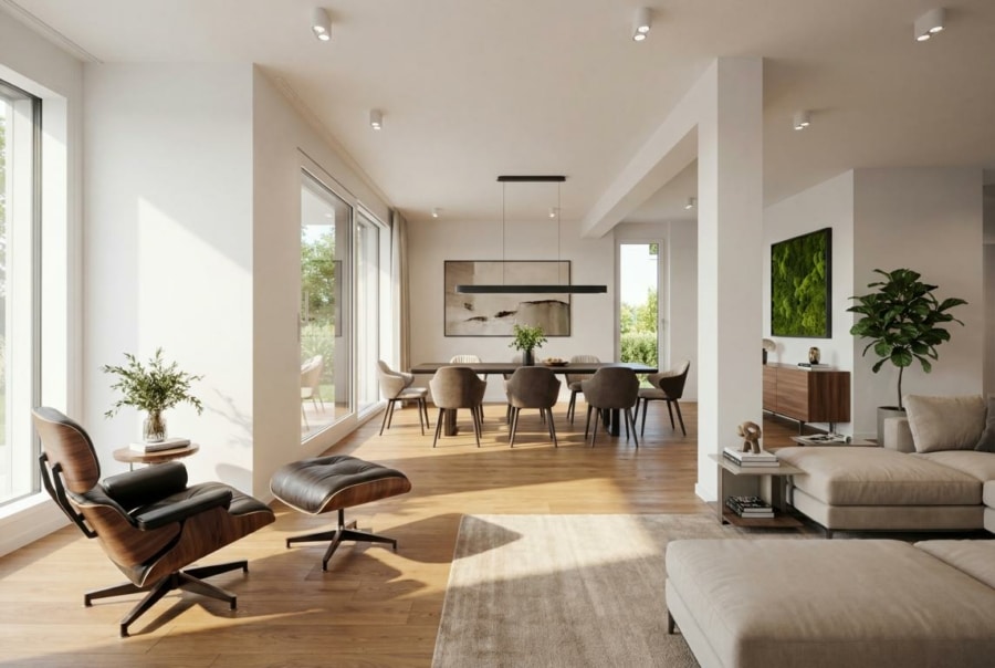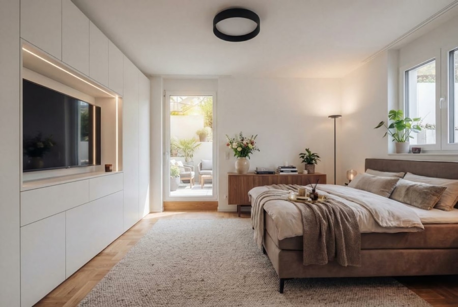 Der Wohn- und Essbereich bildet den zentralen Bereich der Wohnung. Große Fensterflächen sorgen für viel Tageslicht und eine helle Atmosphäre. Von hier aus gelangen Sie direkt auf die Terrasse und in den eigenen Gartenanteil, der den Wohnraum nach außen erweitert und Platz für Erholung oder gemeinsame Zeit bietet.