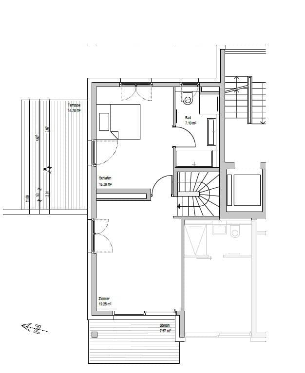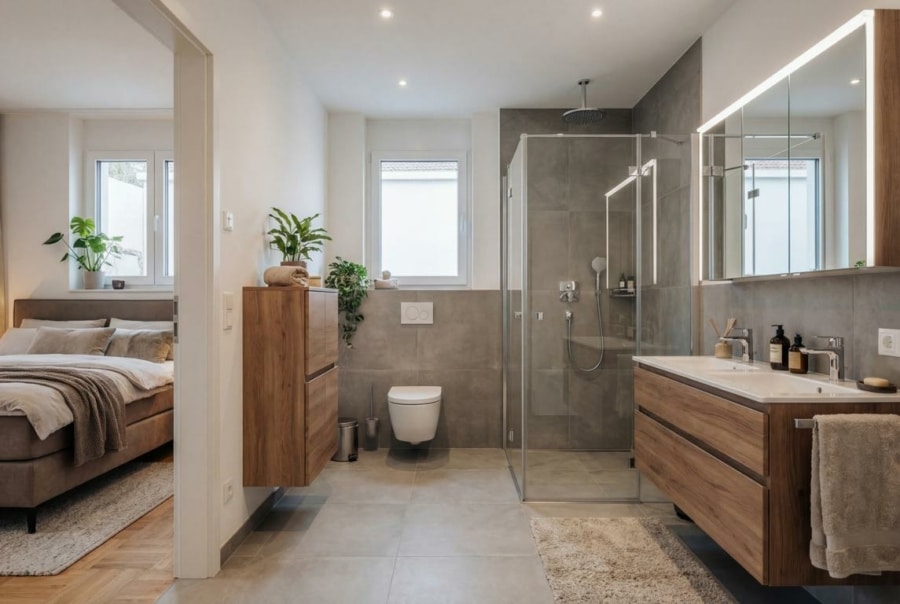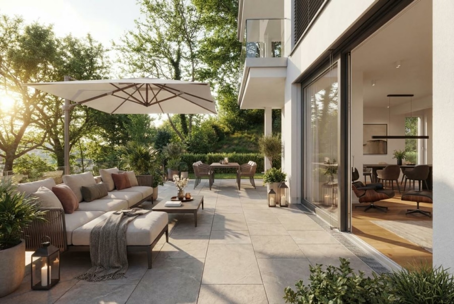 Im oberen Geschoss liegen die Schlafräume in ruhiger Ausrichtung. Das Schlafzimmer verfügt über einen direkten Zugang zu einer weiteren privaten Terrasse. Ein Balkon ergänzt diesen Bereich und schafft zusätzlichen Freiraum im Alltag.