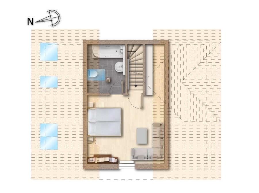 Über die Treppe im Eingangsbereich gelangen Sie in das großzügige Studio, das vielfältige Nutzungsmöglichkeiten bietet und Raum für individuelle Wohnideen lässt. Praktisch integrierte Einbauschränke und eine Nische sorgen hier für zusätzlichen Stauraum. Das angrenzende Tageslichtbad verfügt über eine Badewanne, WC und Handwaschbecken.