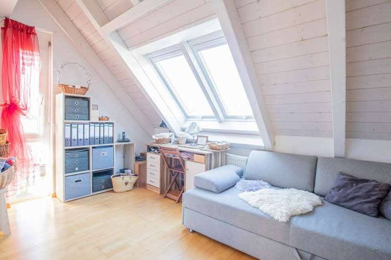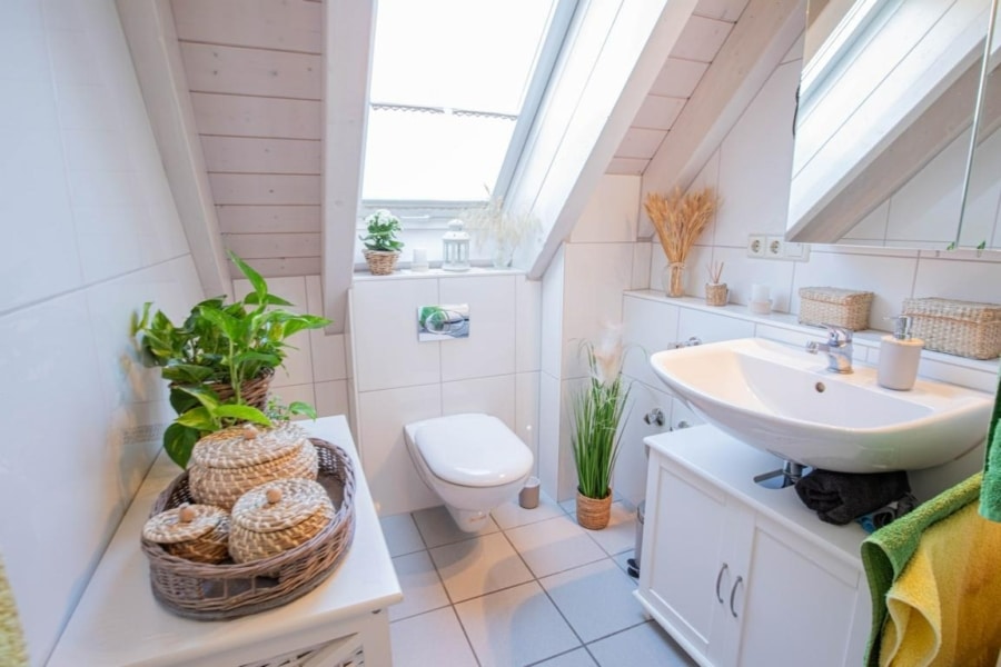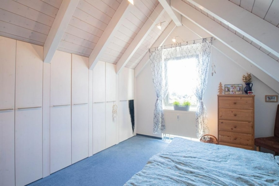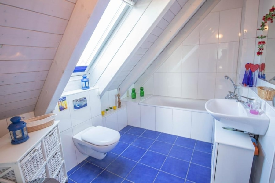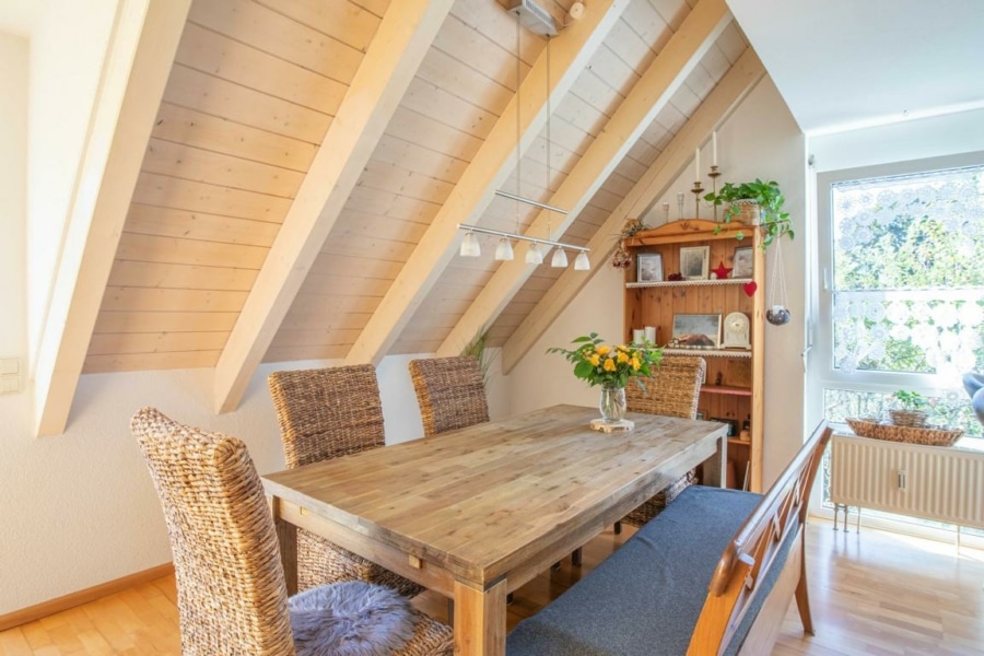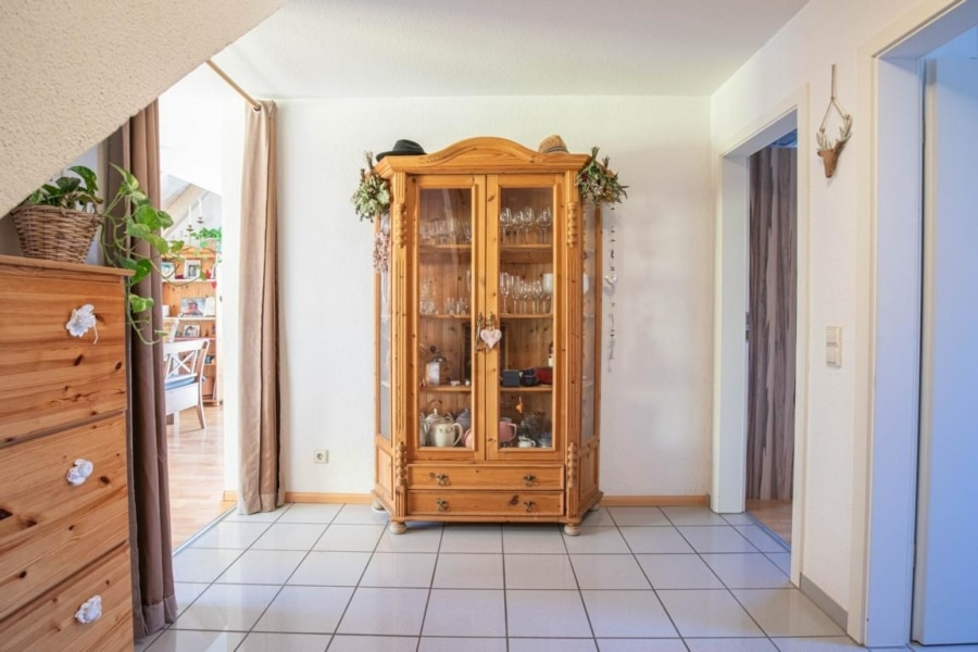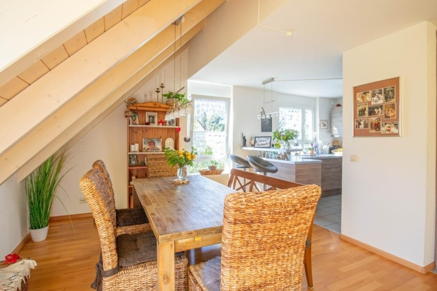 Die Wohnung ist mit Parkett, Fliesen und Teppichboden ausgestattet. Die Dachschrägen in beiden Etagen schaffen eine besonders gemütliche Wohnatmosphäre.