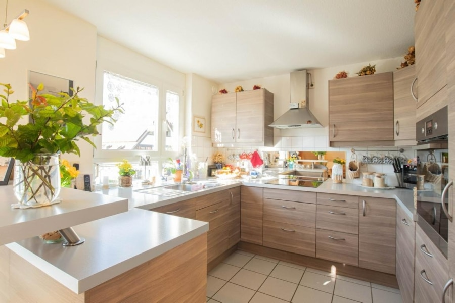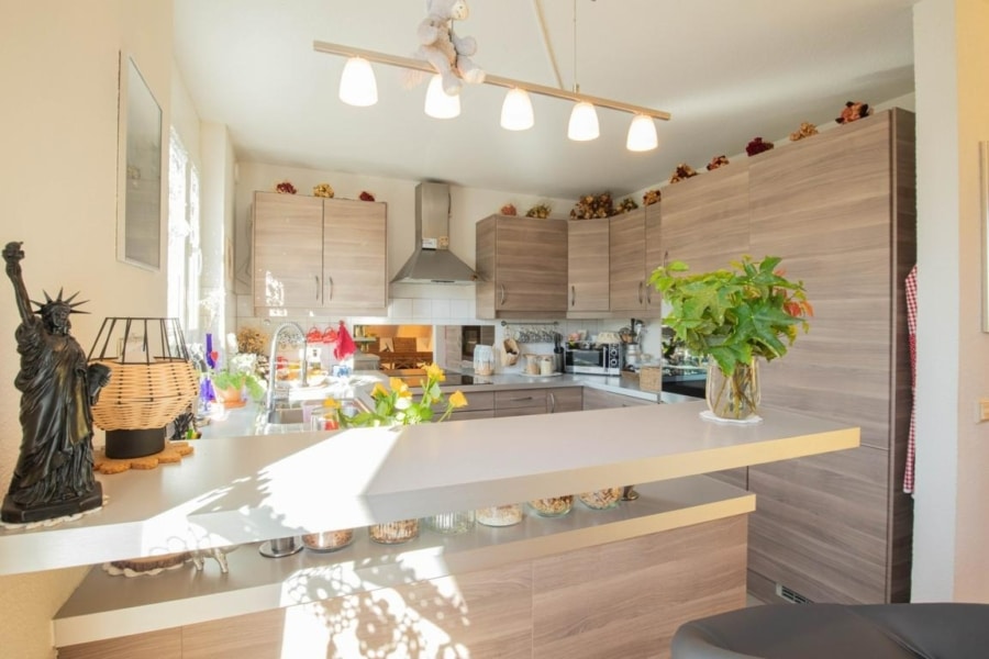 Die moderne Einbauküche (im Kaufpreis enthalten) bietet viel Stauraum und Arbeitsfläche sowie eine praktische, integrierte Sitzmöglichkeit. Die Küche und der Essbereich gehen nahtlos ineinander über.