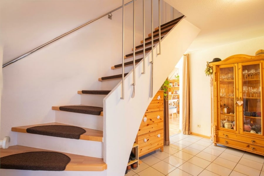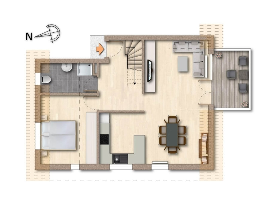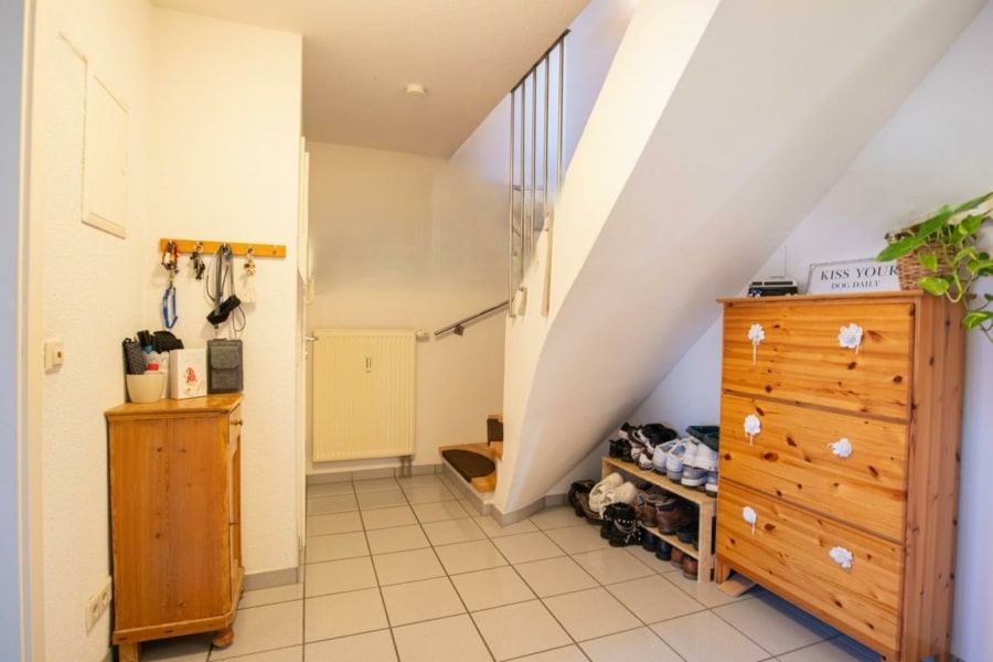 Über das Treppenhaus gelangen Sie auf die Wohnetage. Es erwartet Sie der großzügige Eingangsbereich und der zentrale Flur. Auf dieser Ebene befindet sich der offene Wohn-/Essbereich mit Zugang zum sonnigen Balkon, eine separate Küche, ein flexibel nutzbares Zimmer sowie ein Gäste-WC mit Dusche. Der lichtdurchflutete Wohn-/Essbereich bildet das Herzstück der Wohnung.